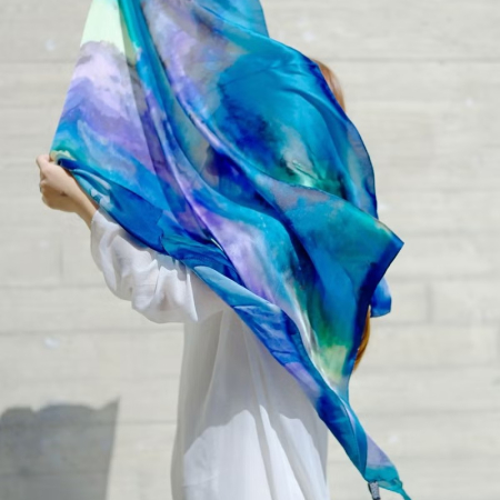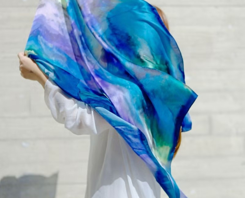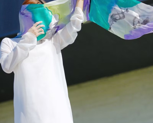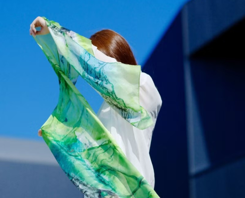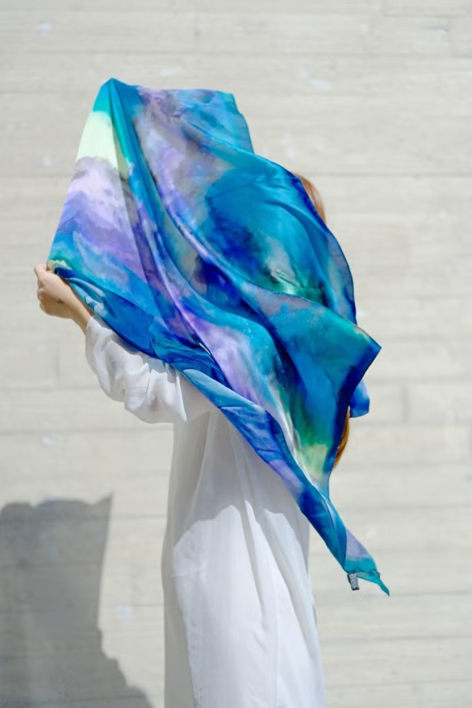 文字是人類思想的載體,傳承我們生活經驗的智慧以及感受。究竟它是否能精確、完整地傳達人世之中情感的交錯細膩?抓住思想中隱隱竄動的念想,使行草墨線如同潤物無聲的流水穿過身體,讓絲巾披露在身上,好似披戴了人類千萬年以來的歷史文化。