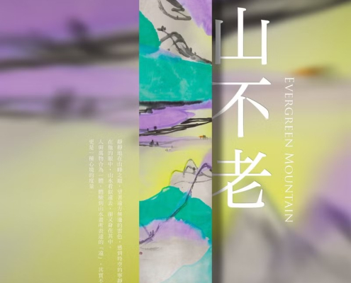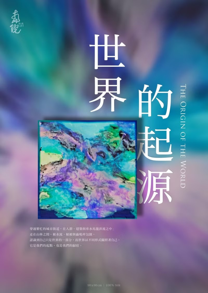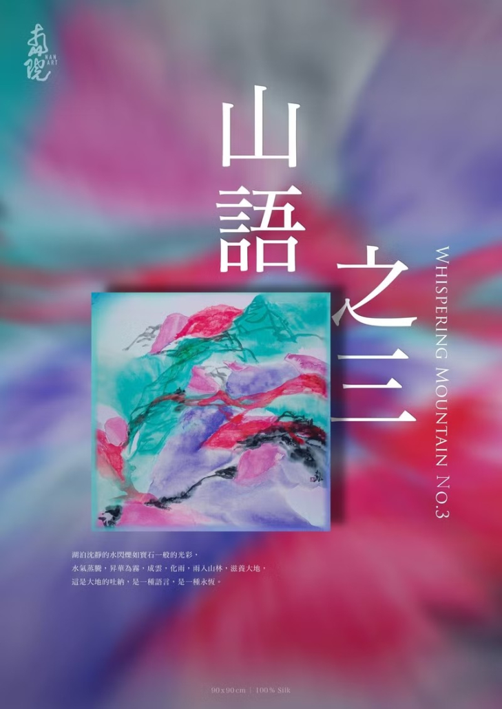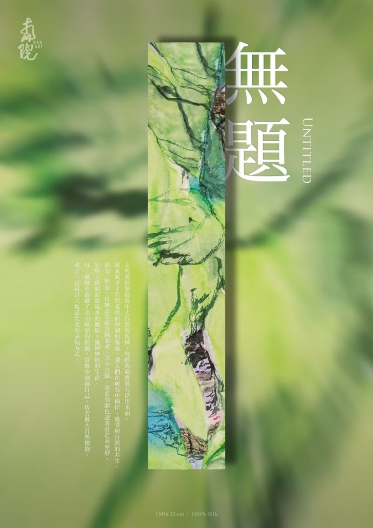 主題分別以抽象山水、書法線條的融合,傳達自然景觀的山川百態,以及文字與書法相互映照的融合。山川如此多嬌,在宇宙初始的混沌漩渦、山嵐的湖光瀲灩、驚濤巨石中忽見的微觀景物、鵝黃湖色的旖旎與煙雨朦朧之中,生意盎然的春意,盡現於柔膩的絲綢上。